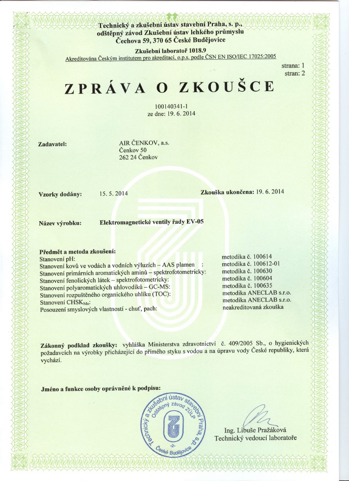 - Zpráva o zkoušce elektromagnetický ventil EV-05 - strana 1 (219.20 KB)